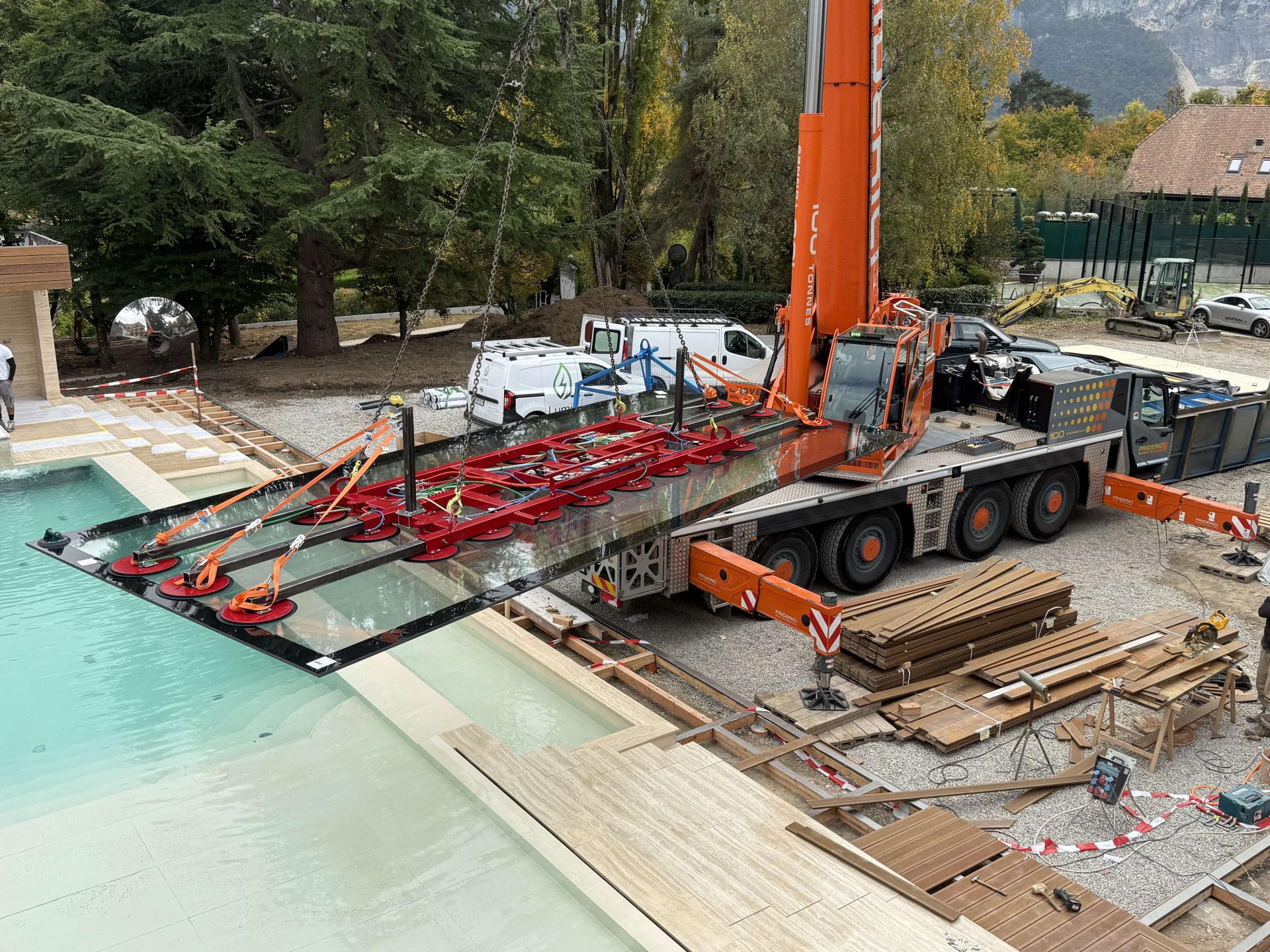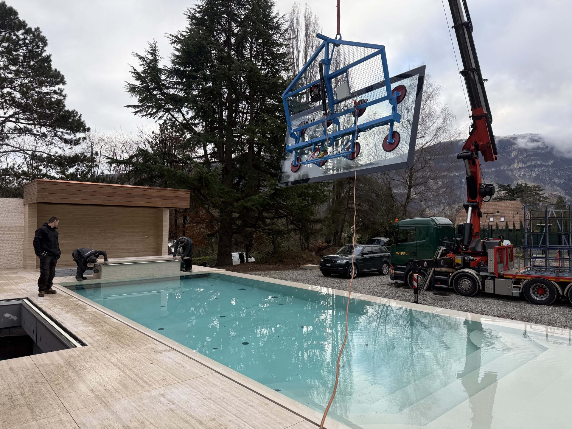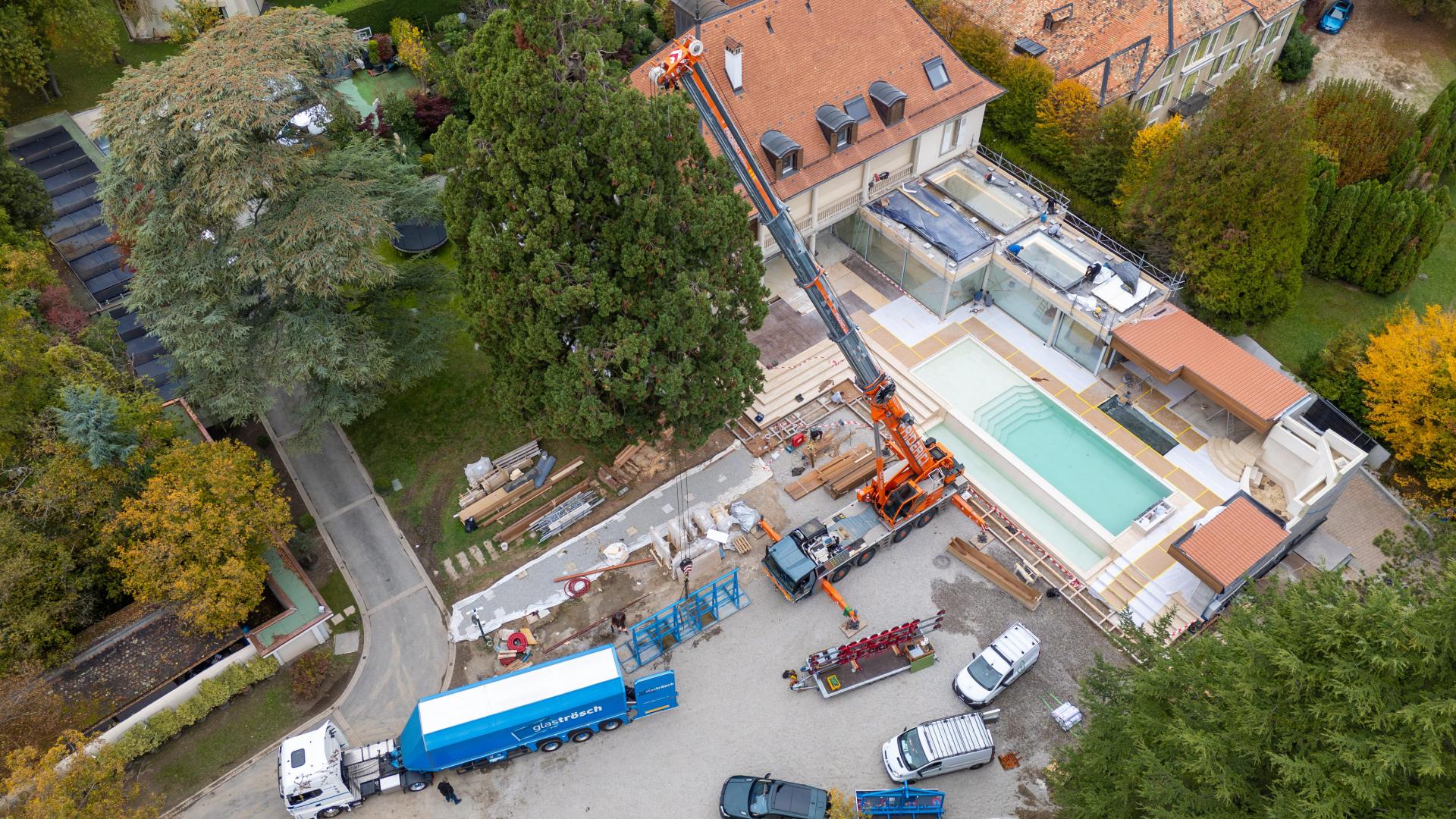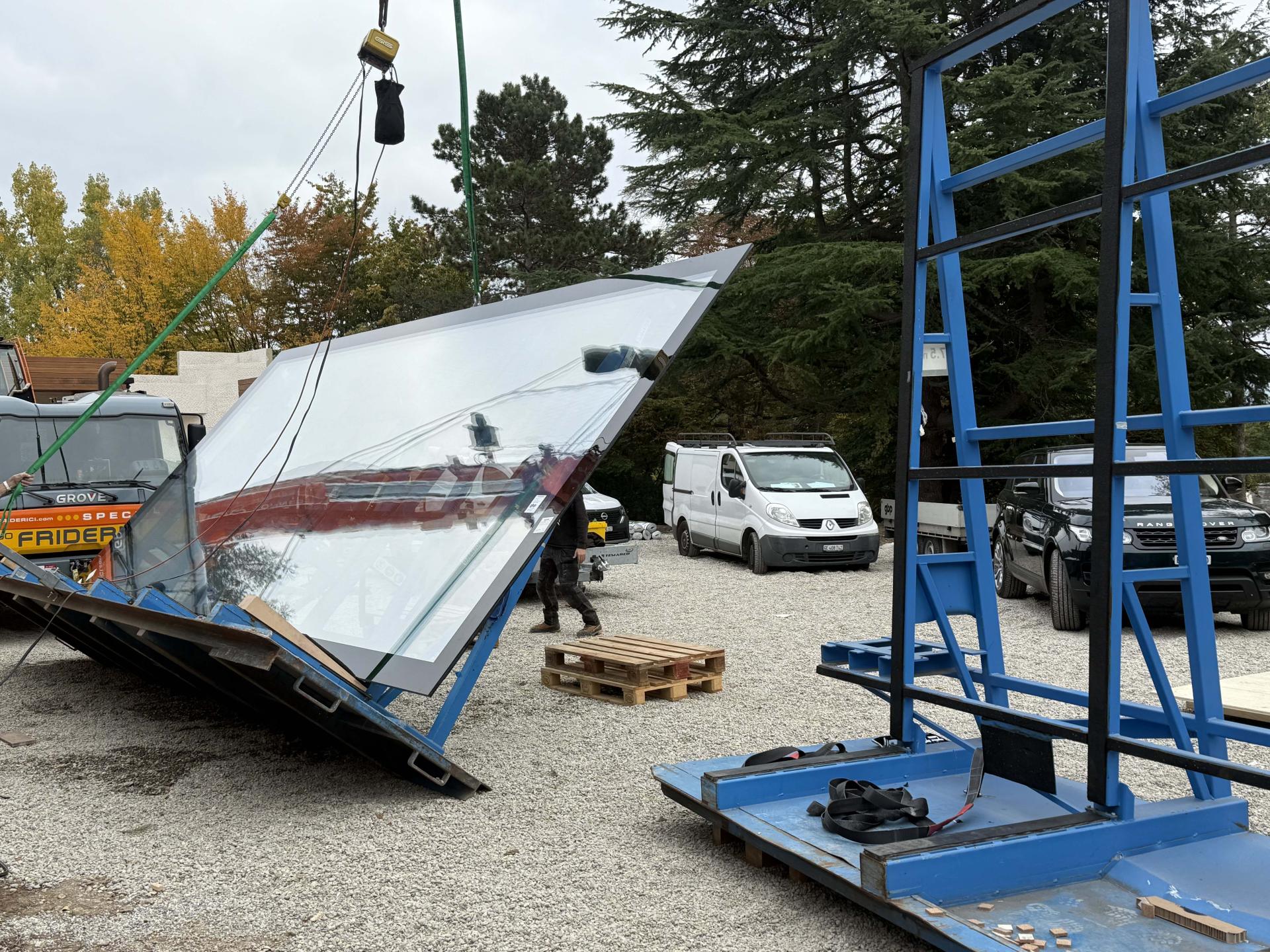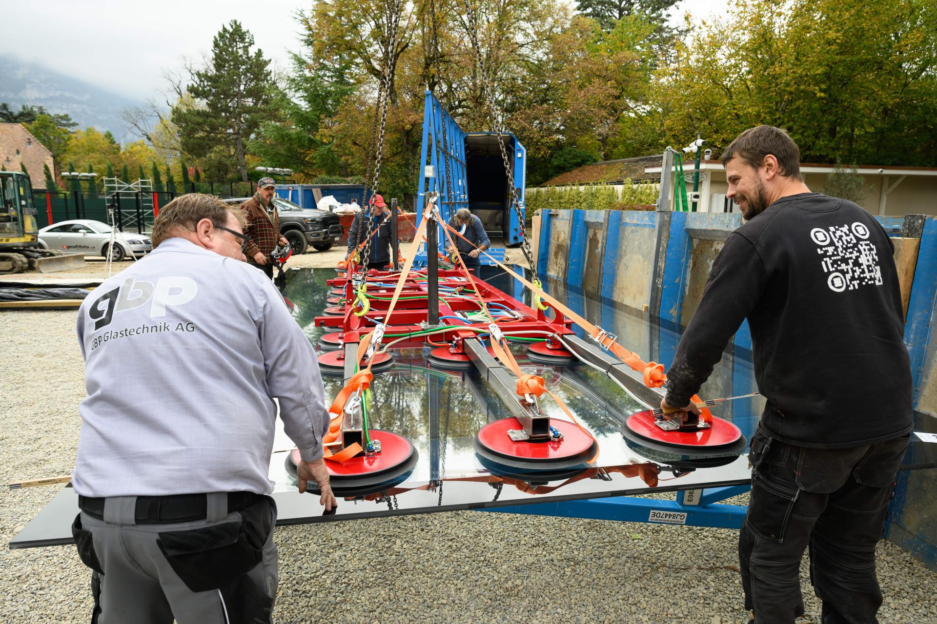 570 Kg Schneelast, Glas – Element Grösse 5 x 2 m, Spezial - Montage auf engstem Raum im Dorfkern von Zermatt.
